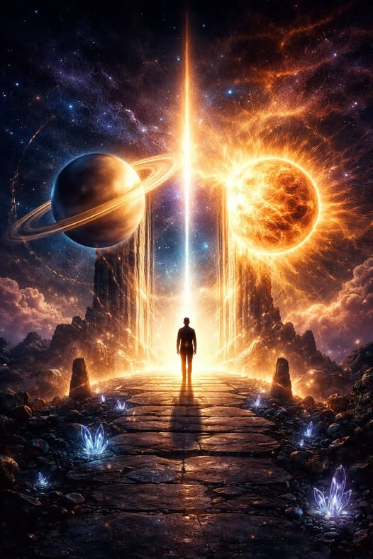 Die Sonne steht für dich, für deine Lebenskraft, deinen Ausdruck, deinen Mut, dich zu zeigen. Saturn steht für Grenzen, Verantwortung und die unerbittliche Essenz dessen, was Bestand hat. Wenn diese beiden Kräfte in Spannung geraten, entsteht ein Moment der Wahrheit. Ein kosmischer Scheideweg, an dem Entscheidungen nicht länger aufgeschoben werden können.