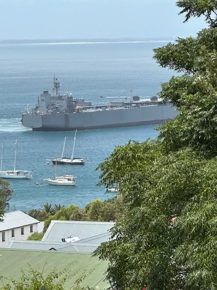 Gestern flogen iranische Hubschrauber über mein Haus. Ich übertreibe nicht. In der Marinestadt, in der ich lebe, liegt ein iranischer Hubschrauberträger zu „Übungszwecken“. An dem Manöver sind Iran (2 Schiffe), China (2 Schiffe) sowie Südafrika, Russland und die VAE (je 1 Schiff) beteiligt. Ich kann all das von meinem Bett aus sehen. Das Bild des Hubschrauberträgers beim Einlaufen in den Hafen habe ich von meinem Balkon aufgenommen.