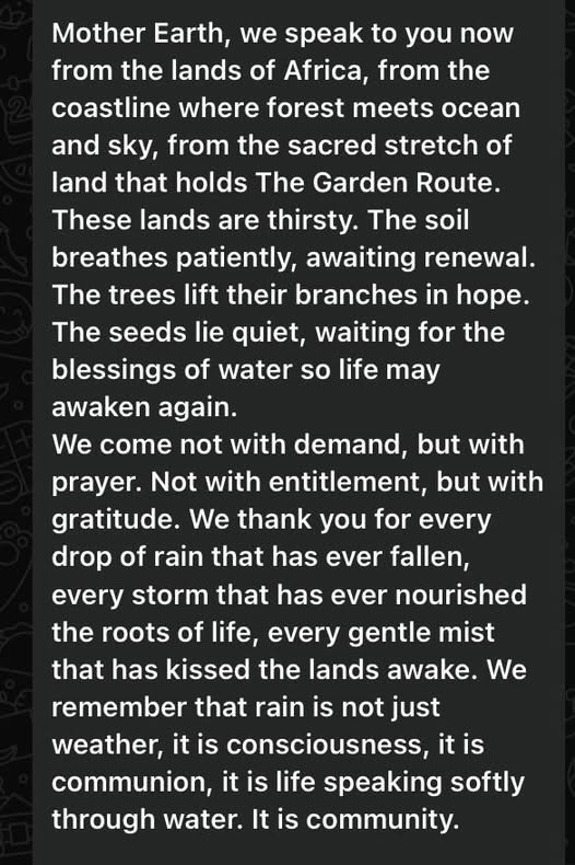 Dieses Regengebet wurde mir für unsere ausgedörrte und von Feuern verwüstete Garden Route im Westkap zugesandt.