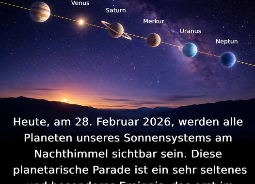 Ihr Lieben, am heutigen Abend (28. Februar 2026), vor allem kurz nach Sonnenuntergang, findet ein besonderes Ereignis statt, denn alle Planeten unseres Sonnensystems werden gleichzeitig am Nachthimmel sichtbar sein. Dabei können wir in westlicher Himmelsrichtung Merkur, Venus und Saturn sehen und in südöstlicher Himmelsrichtung Jupiter. Uranus und Neptun sind wiederum in südwestlicher Himmelsrichtung sichtbar, jedoch ist dafür ein Teleskop erforderlich. Das Besondere dabei ist, dass sich eine solche Konstellation erst wieder in etwa 14 Jahren – also um 2040, wiederholen wird. ![]()
