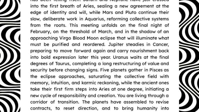 Saturn und Neptun haben gerade den ersten Atemzug des Widders betreten und besiegeln eine neue Vereinbarung an der Schwelle von Identität und Willenskraft, während Mars und Pluto ihre langsame, bewusste Arbeit im Wassermann fortsetzen und kollektive Systeme von Grund auf neu ordnen. Dieses Treffen entfaltet sich in der letzten Nacht des Februars, an der Schwelle zum März, im Schatten einer bevorstehenden Blutmondfinsternis im Zeichen Jungfrau, die sichtbar machen wird, was gereinigt und neu geordnet werden möchte.