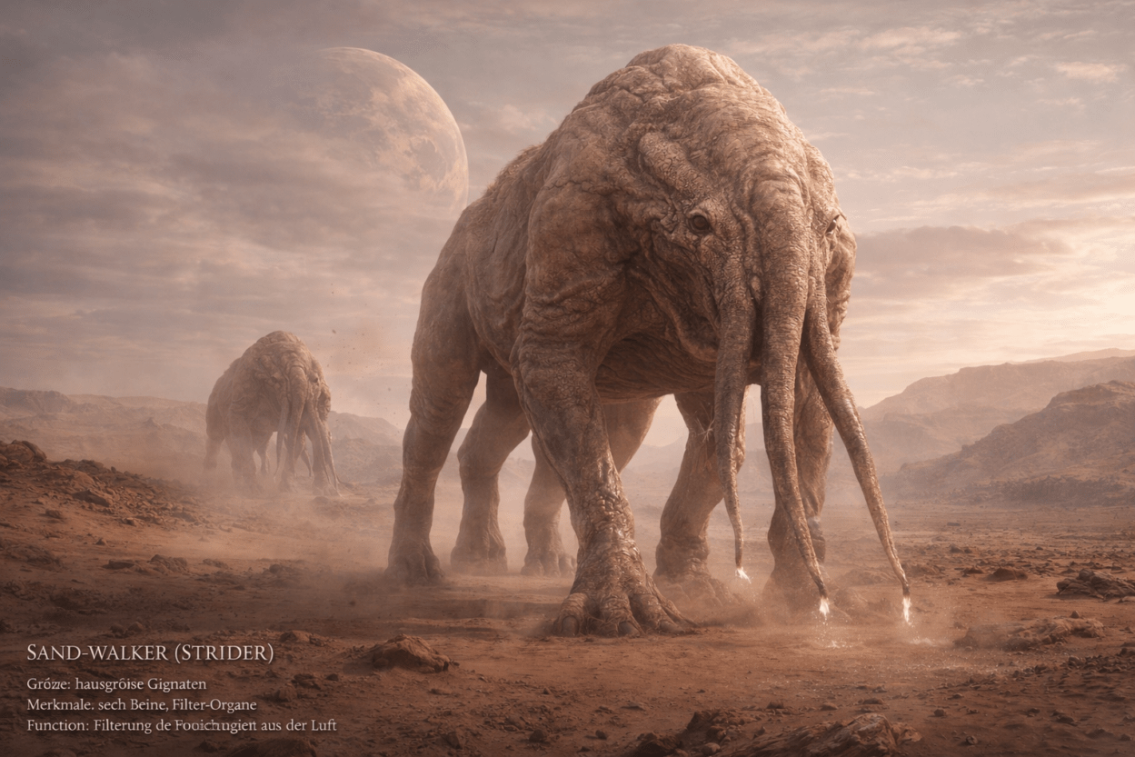 Es gab Flugwesen mit einer Flügelspannweite von bis zu 15 Metern, die auf den thermischen Winden der Schluchten segelten. In den großen Meeren lebten biolumineszente Wesen, die nachts die Küsten der Marsstädte beleuchteten.