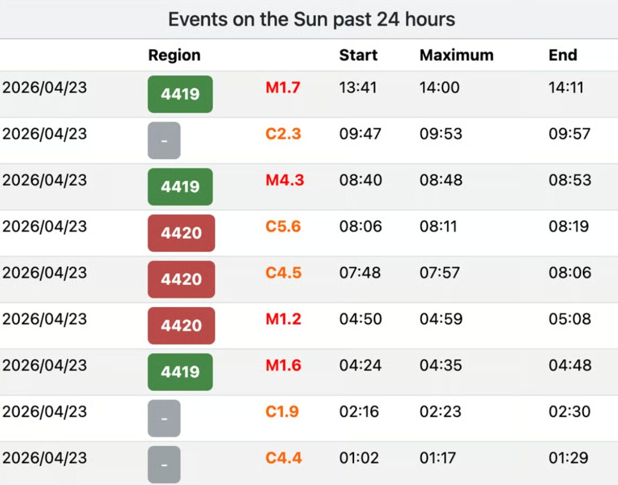 Nach Wochen der Ruhe beginnt die Sonne wieder aktiver zu werden … und das bedeutet, dass auch wir uns wieder lebendiger fühlen. Heute, am 23. April, wurden bereits vier M Klasse Sonneneruptionen registriert sowie einige koronale Massenauswürfe.